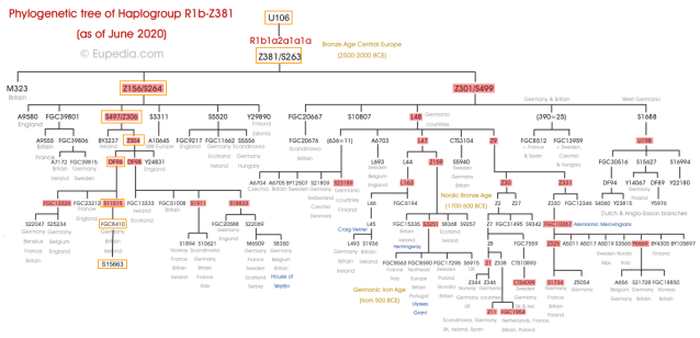 A group of 22 SHELDON testers to date, all of whom are related (we call SHELDON Group B) are all Haplogroup R and U106. The SNP path for this group has been boxed in orange ending with SNP S15663. You can see that there is a broad subdivison at the top into M323, Z156 (aka S264) and Z301 (aka S499). Each series of new SNPS further divides the group into those that have that SNP and those that do not.