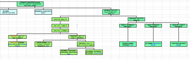 Because we have enough Big Y results for Group B SHELDON we can build a phylogenetic Tree coming forward in time. We begin with the SNP FGC62079 which is just below SNP S15663 (see above Eupedia Tree) and as you can see includes many surnames. Below it is the SNP BY35166 which to date only includes those bearing the SHELDON surname. THIS SNP then Defines SHELDON Group B! It includes both Group B Progenitors: John (13) SHELDON and Isaac (8) SHELDON (part of the Sheldon Family Association nomenclature). Those in Group B1, the Descendants of Isaac (8), have a SNP FGC74472 which is not found in descendants of John (13), thus creating a major subdivision. John (13) descendants are further separated by the SNP FGC73741. Descendants of John 1, 2, Isaac 3, Thomas 4 are positive for this SNP and descendants of his brother John 1, 2, Isaac 3, Robert are negative so we know this SNP occurred in Thomas! This is how testing can help identify branches and so SHELDONs can establish there line even if there is no paper Trail with relatively inexpensive SNP testing. Cost for a single test at YESQ.org is $18 (plus one time charge for a kit of $5). With more testing we will be able to further identify branch SNPS.