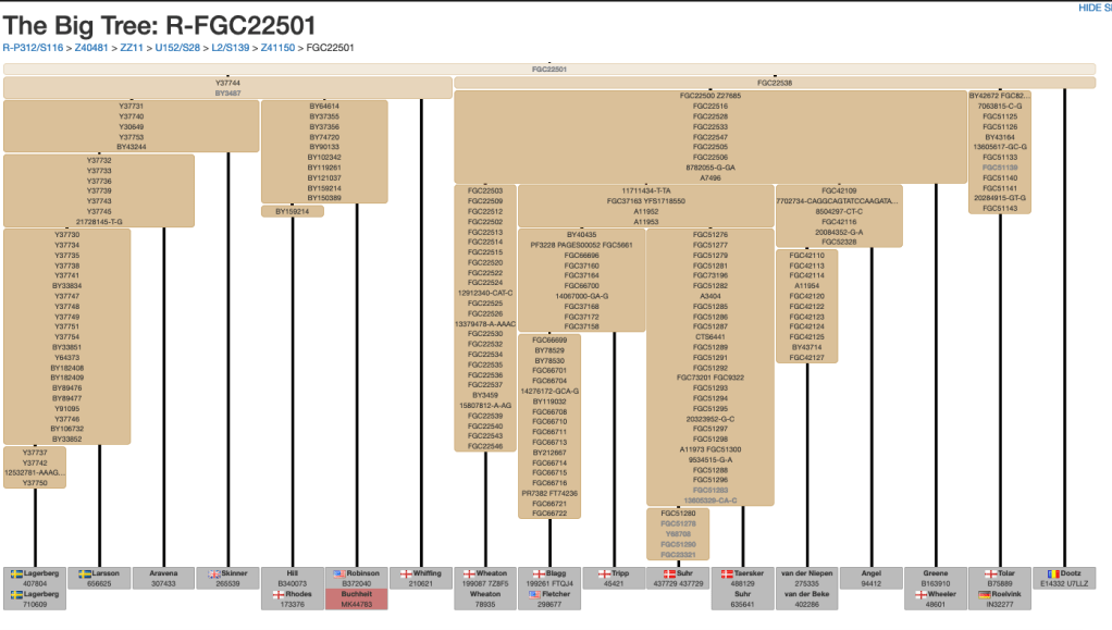 In this lesson I hope to explain what comprehensive Y testing means to the average genetic genealogist. Anyone using DNA for genealogical purposes is a genetic genealogist but the range of how far one delves into DNA testing varies from those taking a 37 marker Y test to those testing mtDNA, YDNA and atDNA at multiple companies. For this lesson I want to talk about the practical application of advanced Y-DNA SNP testing. The International Society of Genetic Genealogists (ISOGG) maintains a SNP index and the Y Haplogroup Tree, however because new SNPS are being found daily the most comprehensive information is often within Haplogroup projects and Surname projects and their administrators are the best source of current information. In addition FTDNA maintains a Y Haplotree and a mtDNA Haplotree that are public, as does YFULL. YFULL and Full Genomes Corporation offer $49 NextGen Sequence Interpretation. If you are a member of Haplogroup R-P312 Y-DNA interpretation is available through Alex WIlliamson’s Big Tree at no cost if you upload your results.