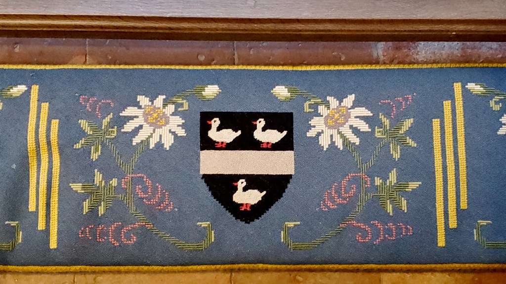 3. On a chevron (two diagonal stripes meeting at an angle), three Sheldrakes, on a canton (a region of a field) a rose.