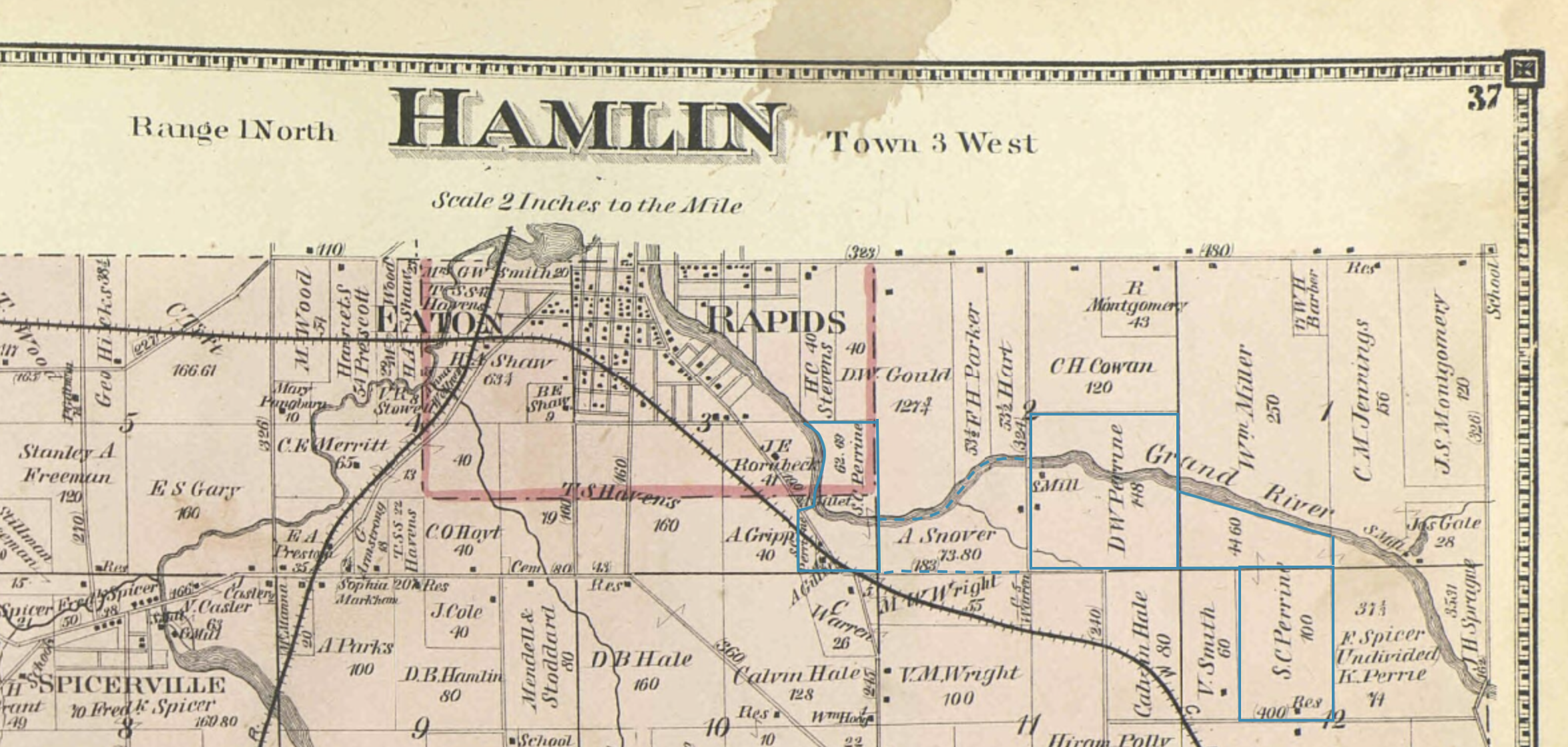 I have written posts about my great grandfather Justus Warren SHELDON before but this one is going to focus on his time in Eaton Rapids, Eaton County, Michigan. It seems that Matthew LaRue “Rue” PERRINE owned a large 472 acre farm on the banks of the Grand River but he died of Typhoid fever in September of 1894 at the age of 82; upon which time the farm was purchased by Justus Warren Sheldon. I am unable to locate the exact location of the farm but from this plat map from 1873 and the designation of 472 acres I can come close.