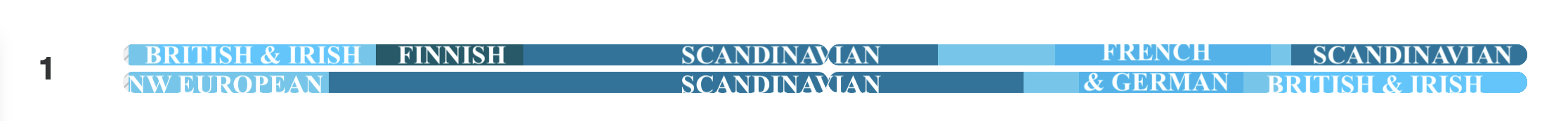 Let’s take a look a closer look at Chromosome 1 from Ancestry. Basically it shows MATERNAL side on top with mostly Swedish/Danish and a bit of Norwegian on Right Tail. On my father’s side it shows England and Northwestern Europe.