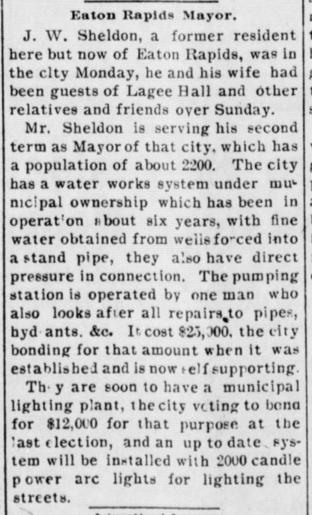 According to a recent property listing his house at 221 State street is a “Superb Victorian Era home built in 1901 by Warren Sheldon. Original and beautiful white oak woodwork throughout. Enter this home and enter an era of Grace and style 5 bedrooms , 2 baths, gorgeous!” A newspaper article from 1904 mentions Justus serving his second term as mayor of Eaton Rapids. He was first mayor in 1899 and then again in 1904.
