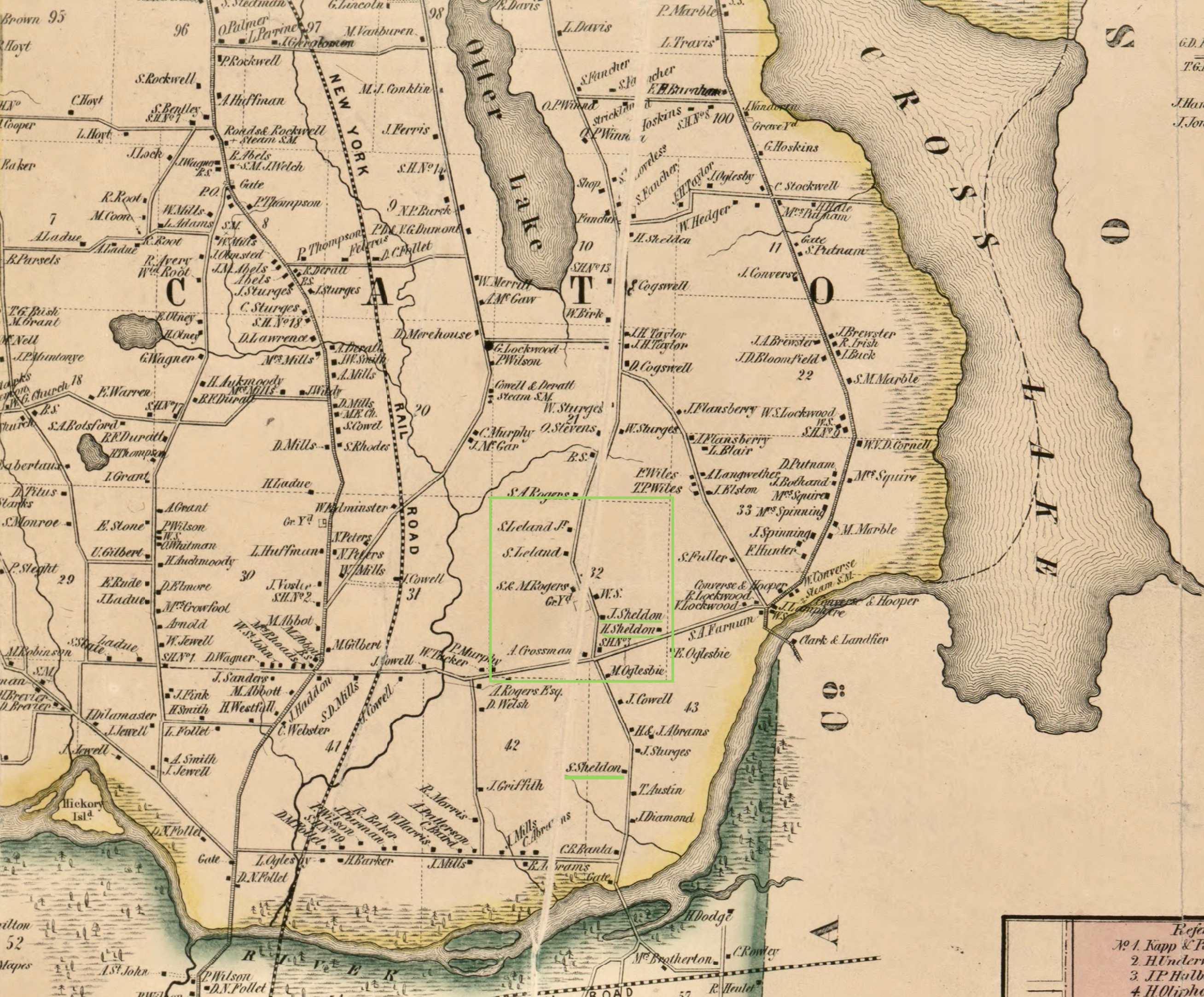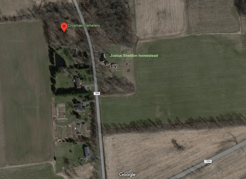 The proximity to the family’s final resting place is probably a clue for many to the proximity to which they lived. My cousin visited the cemetery where our Sheldon’s are buried in Cato, Cayuga, New York never knowing that the family farm was nearly across the road. See map at top of this post. Note the graveyard (Crossman Cemetery) and then Justus Sheldon’s Farm across the road. Here is the Google version.