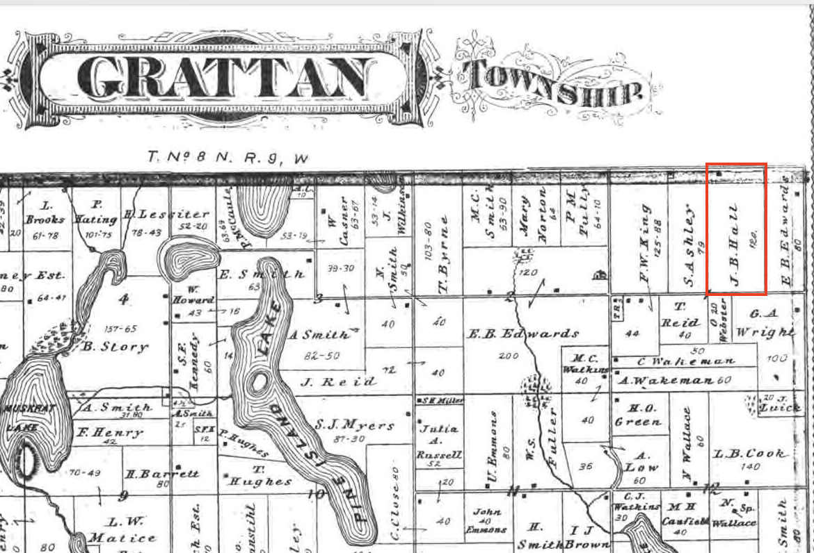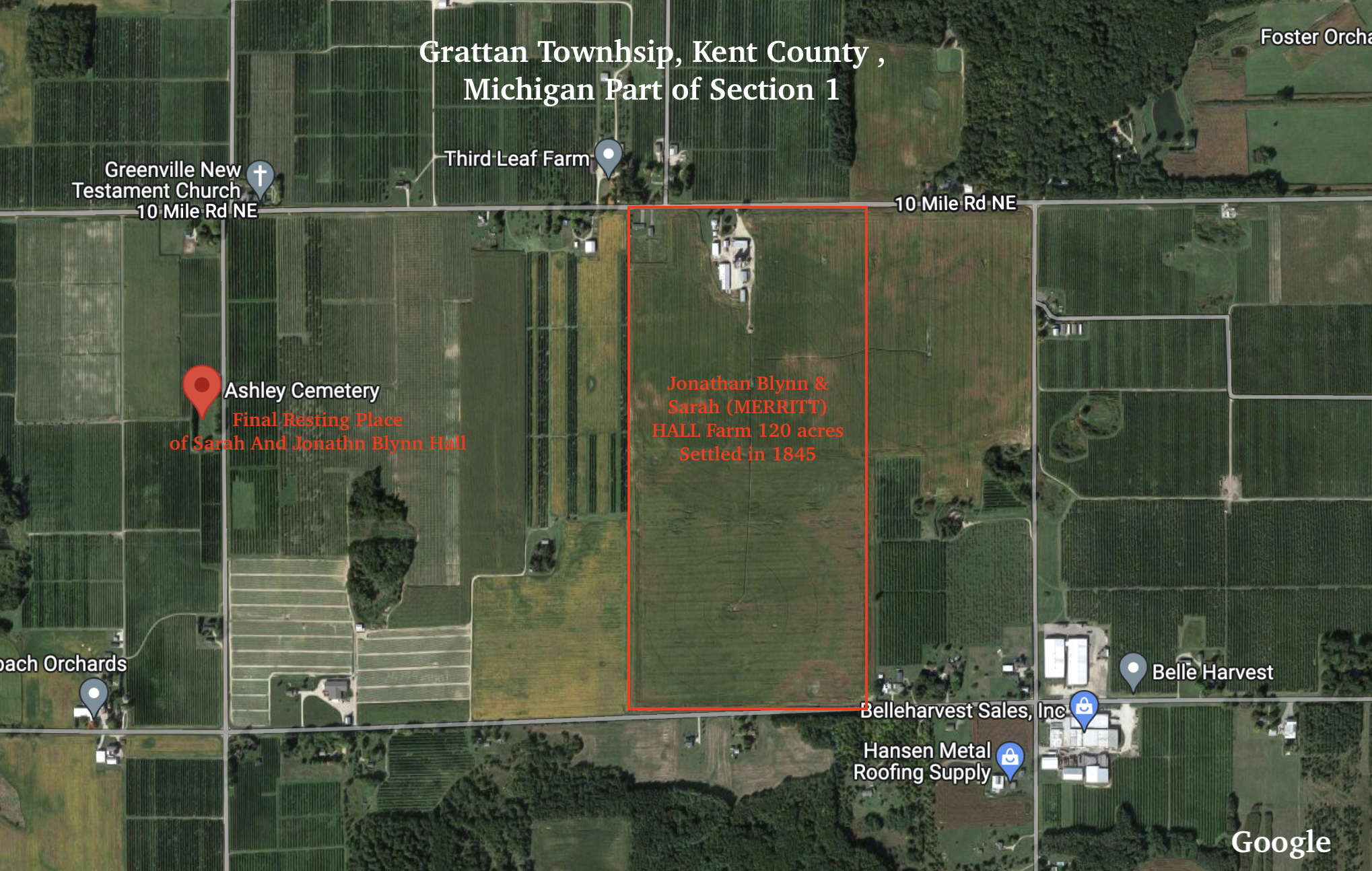 So let’s look at a couple of recent ones, that I just uncovered. My 2nd great grandfather Jonathan Blynn HALL according to The History Of Kent County Michigan came to Kent County in June of 1844 purchased land there and then returned to his native Middlebury, Genesee County (now Wyoming) New York where he married my 2nd great grandmother Sarah Jane MERRITT the first of January 1845. They settled in Grattan Township, Kent County Michigan. We can locate their farm on the 1894 Land Ownership Map as seen here: