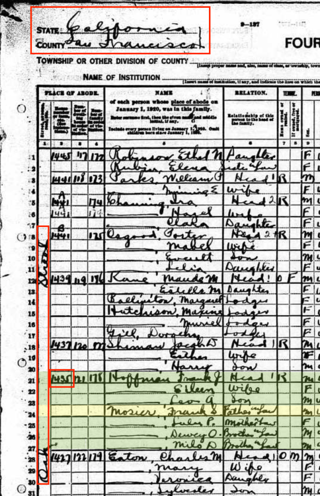One of the many wonders of Google Maps is the ability to travel down many streets and roads via “Street View.” And then of course there is aerial view that allows you to locate your ancestors properties of a bygone area by comparing old Platt and Ownership Maps with current ones. I am always amazed I don’t see more people doing this. Roberts Estes who writes one of my favorite blogs DNA Explained is a shining exception. There are several things required to do this but none are that difficult. If the ancestors you are hunting appear on a census from 1850 or later (and sometimes before that) you are likely to find a community, a township or a post office they lived near listed on the census. If it is 1900 or more recently you may find an actual street address. Sometimes you need to go back or forward a page to see the street name usually written vertically in the first column. Here’s an example from the 1920 Census for San Francisco, California for my great grandparents Frank S & Lulu P Mosier at 1435 Oak Street.