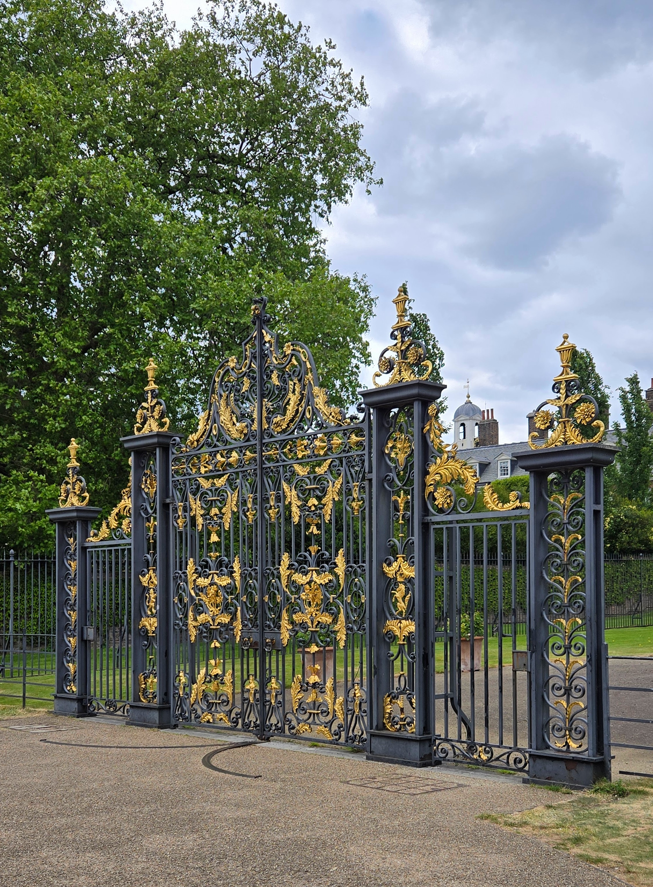 Well its been some three plus weeks since I started my travelogue and I am back to putting it down on paper. As I finished up at The Victoria and Albert Museum and traveled via the Kensington Park Flower Walk and passing the modest (compared to her husband) memorial to Queen Victoria I skirted the edge of Kensington Palace. Where I took a photo through the fence. And admired the gate.