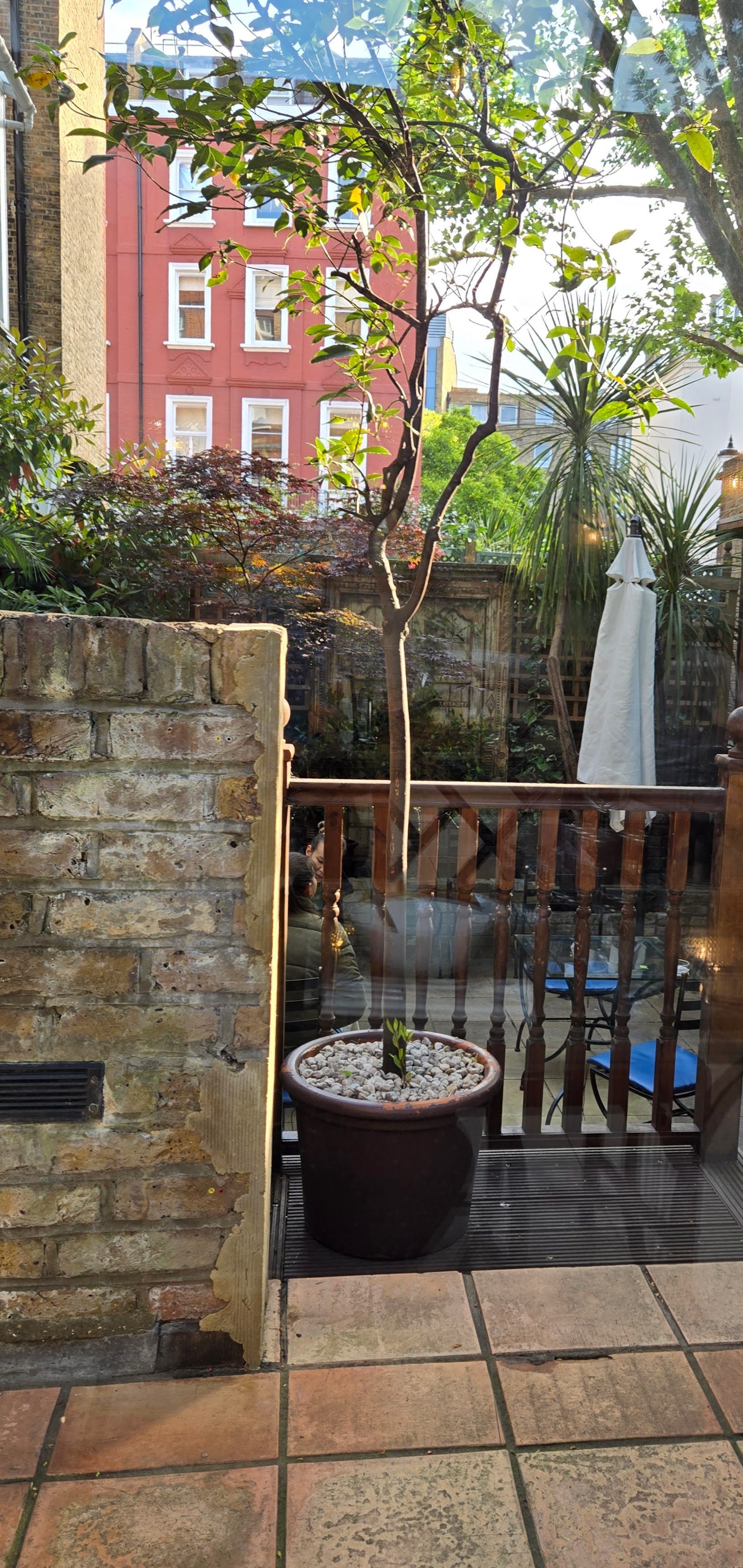 I had an itinerary and a plan, but that was based on traveling with someone who had not been to London before. Upon getting back last night and finding my feet and back complaining more loudly than expected I decided to revamp my plans and downsize my expectations. This was my view of the patio while eating breakfast.