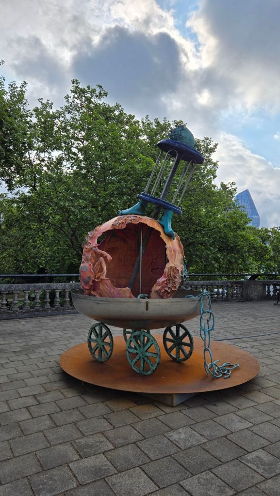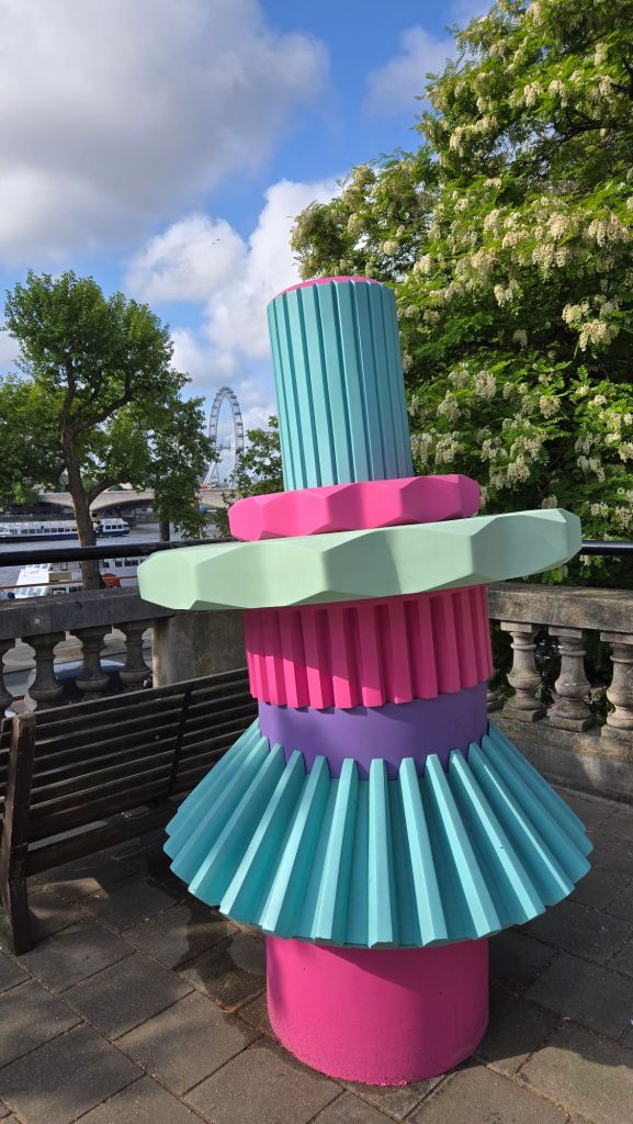 After breakfast I made my way to the Earl’s Court Underground Station and looked to catch the District Line to Temple Station. On exiting Temple Station I happened upon a Women’s art installation beside the River Thames with a fanciful pumpkin carriage with Chain, and a cupcake with the London Eye in the distance.