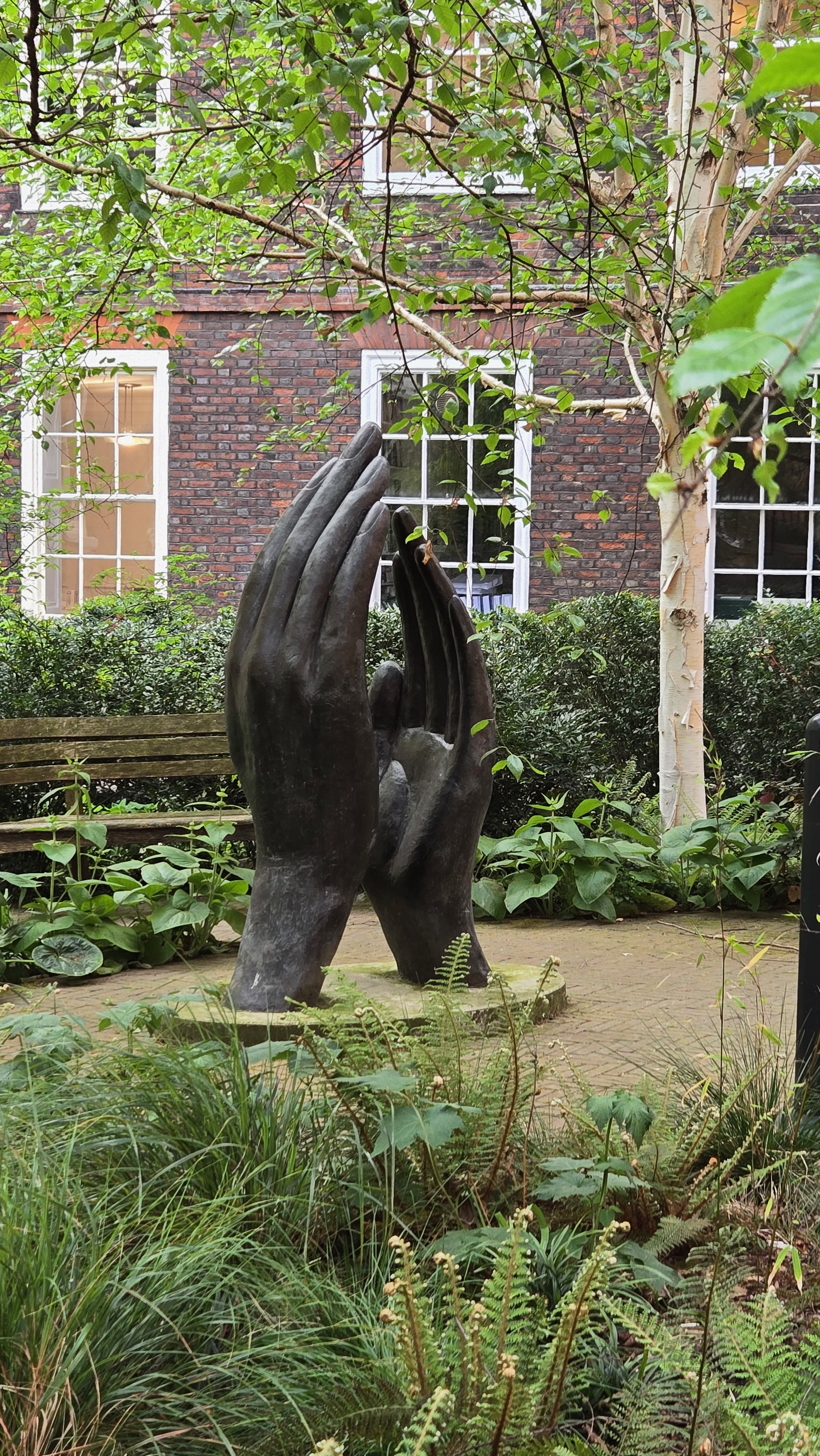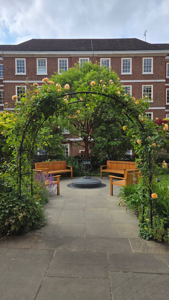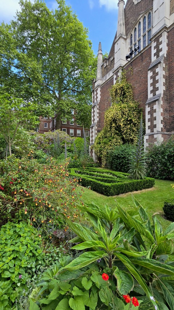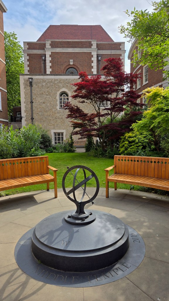 The first garden I discovered was that of Hare Court. This garden was envisioned by the Inner Temple’s Head Gardener, Andrea Brusendorf. Her vision was quite successful. I spent some time exploring this garden and enjoying the benches here and viewing the sculpture ‘Justice’ by Tanya Russell. Viewed from different angles giving very different impressions.