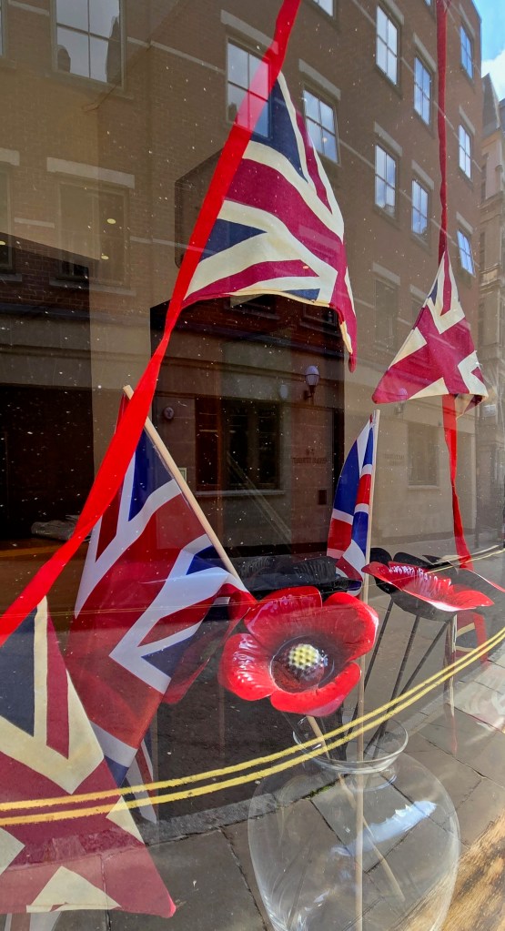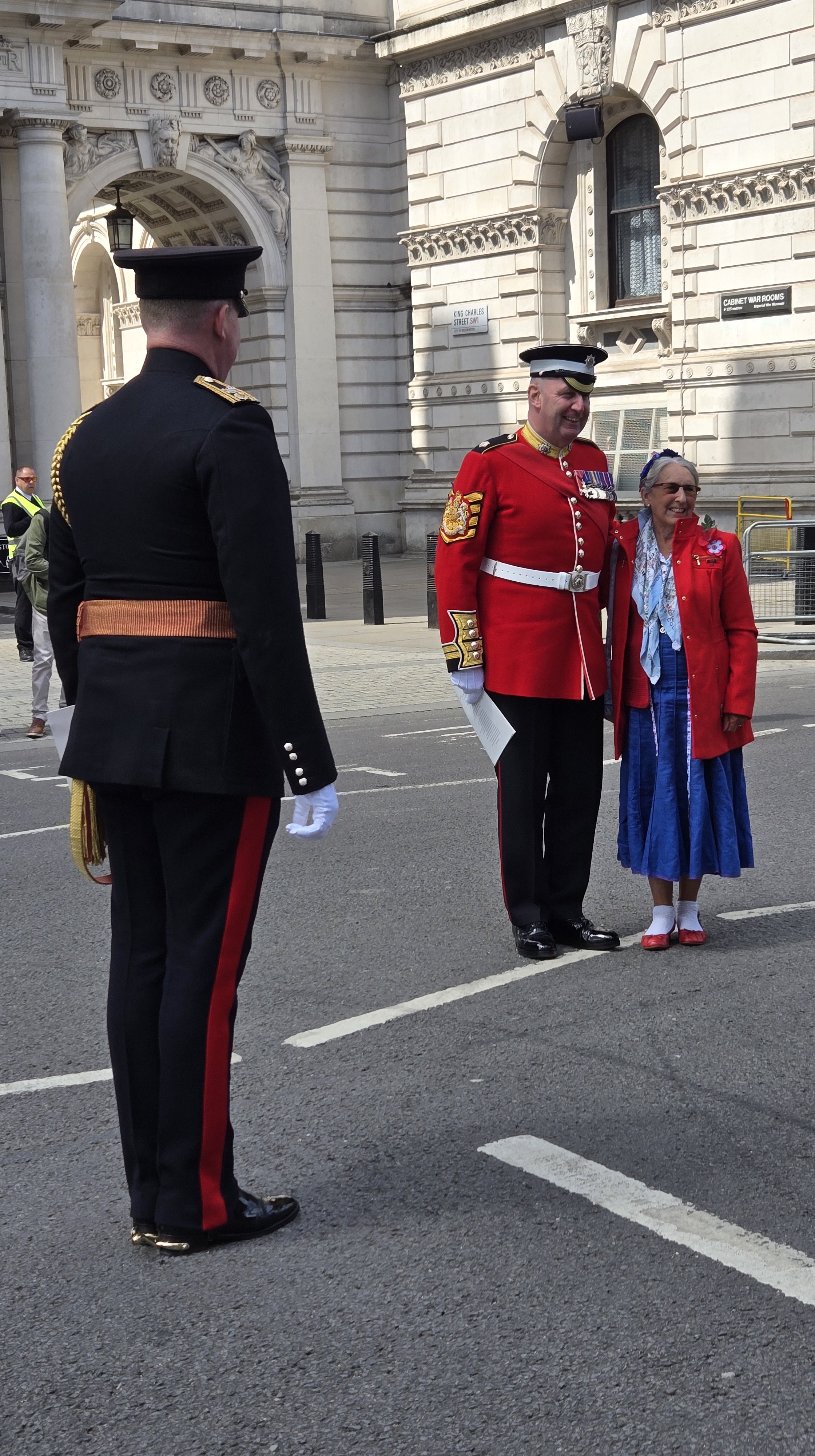 I wandered up Parliament Street to the Cenotaph which is a War Memorial unveiled in 1920 and is the site of the annual National Service of Remembrance. As you can see it was draped in the Union Jack. Then I watched as several dignitaries passed by after exiting the ceremonies at Westminster. There was a women and her husband that caught my eye and I captured this scene. Note in the background is King Charles Street Arch and the Cabinet War Rooms. I don’t know whether she or her husband were vets but she certainly enjoyed taking her photo with this British officer. And she was just too cute—red coat, blue dress and those sling back red Mary Janes with white socks. Her husband had a photo on the back of his coat which I think was of him as a boy during the original VE day. It made the day special. I have often heard my friend Jean (who lives in England) recounting the days during the War.