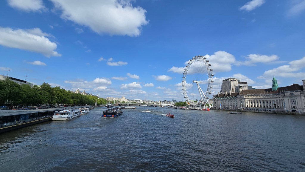 As mentioned in my last post I made a spur of the moment decision to head over to Westminster Cathedral where private ceremonies were to be held with King Charles, dignitaries and veterans in celebration of the 80th anniversary of VE [Victory in Europe, during WWII] at Noon. I had no expectations. It was a way to hit this area and free up more time on Friday. Arriving at the Westminster Underground Station I headed for Westminster Bridge because it was one of those picture perfect days. Remember I had started my day with a view of the London Eye [Ferris Wheel] far to the east up the Thames, looking West. And here I am in the opposite position looking East. Like so many cities built near a major River, London is no exception—on a gray day nothing can look more dismal or depressing —but on a bright sunny day punctuated by soft cumulus clouds, it’s beautiful.