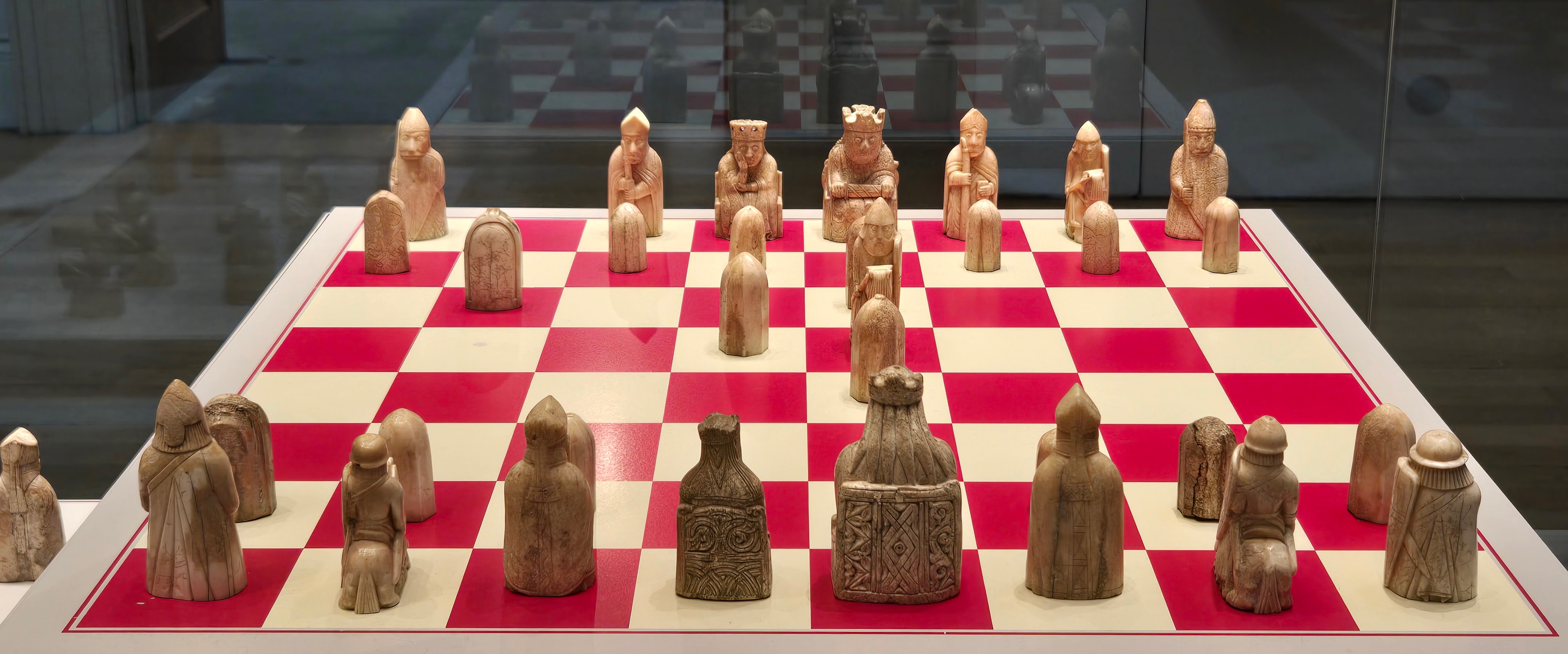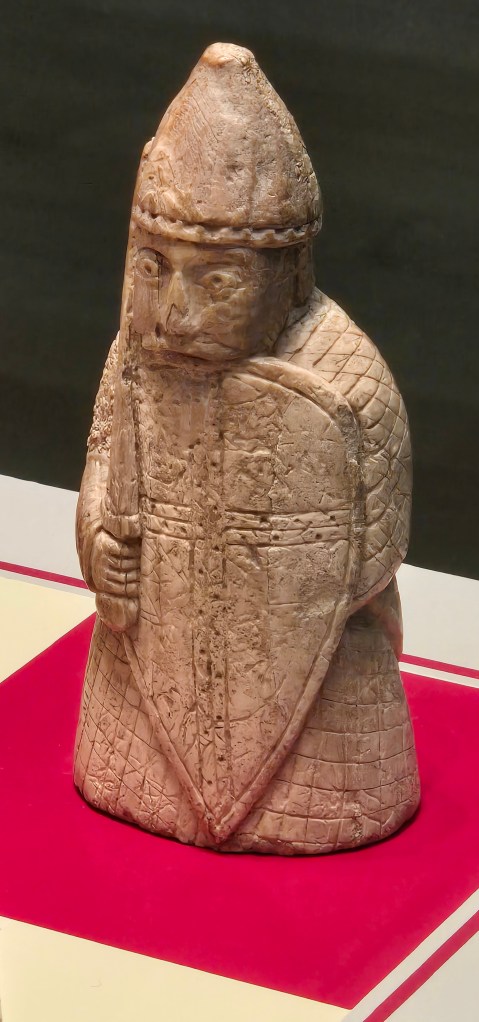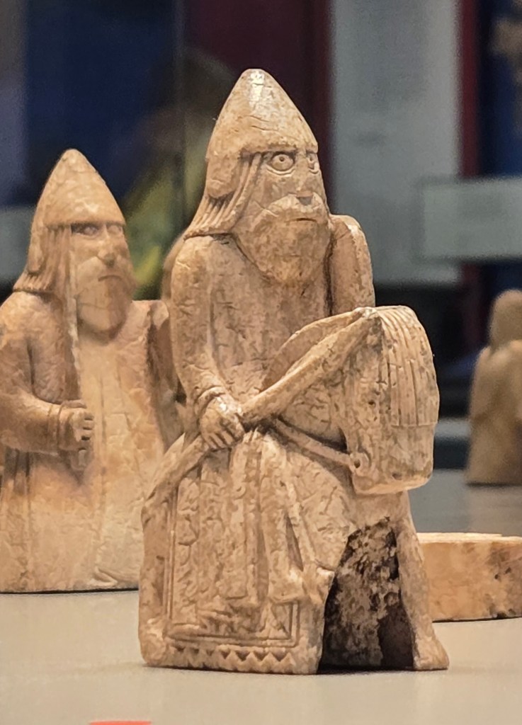The Hebrides are the western most islands, off the coast of Scotland. In preparing for a trip to Scotland some years ago I read the trilogy and a book called “The Sea Room” by Adam Nicholson which will be important later in this trip. In any event the Lewis Chessmen and women [queens] were discovered in 1831 on a beach not specified, on or near Uig Bay, Isle of Lewis. The pieces, 94 in all are fashioned from walrus tusks and a few from whale teeth. The British Museum holds 82 pieces, and the National Museum of Scotland has 11 pieces, and one piece is owned privately. I had seen and photographed those in Scotland on my trip there. The 2 sets combined include 8 kings and 8 queens, 16 bishops, 15 knights, 13 warders some of which are beserkers (rooks) and 19 pawns and a buckle [not sure of the others]. They are “believed” to have been carved in the 12th century in Trondheim, Norway due to similar carvings from there. Good evidence of Viking occupation/incursion in Scotland. It is said the Vikings were one of the most important influences in Scotland. In any event the chessmen captured my imagination and I wanted to see more. You can buy replica chess sets, but they are crude by comparison. I will have to do a side by side comparison—but although the British Museum has more pieces, my initial reaction is the National Museum of Scotland had the more finely carved.