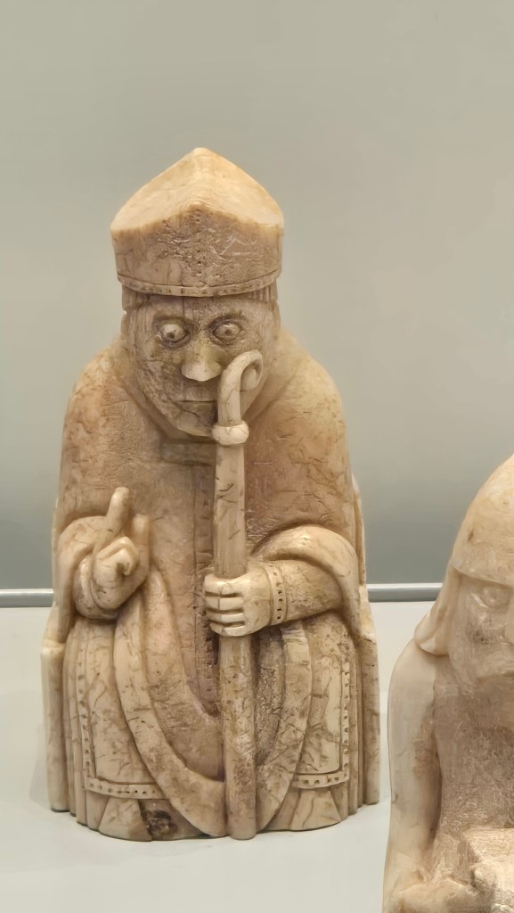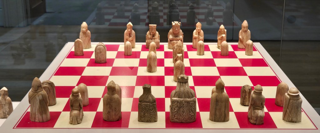 My second, yet most important stop, was room 58 and the Lewis Chessman. Why the Lewis Chessman, you may ask? Good question. I only played chess a little in my youth, so it wasn’t that. I first became aware of the Ivory chessman when reading the historical mystery trilogy by Peter May. The 3 books are “The Black House,” “The Lewis Man,” and “The Chessmen.” This past year an additional novel was added, “The Black Loch.” These all take place in the Outer Hebrides island, of Lewis and Harris.