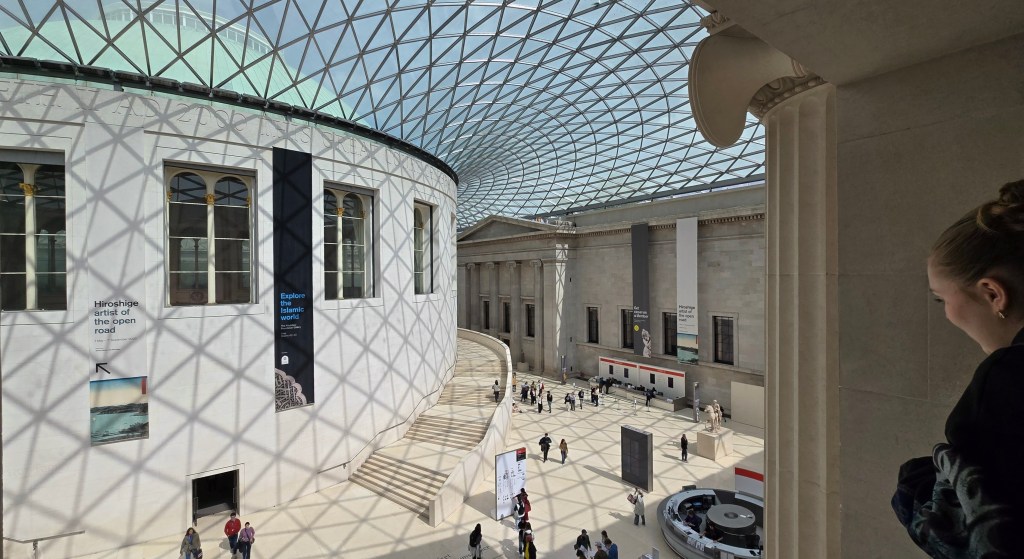 As I have mentioned previously—flexibility is key when traveling. I had tickets for the British Museum for 11:10 AM [First available time slot when I booked ]. But I had arrived there by 9:30 [opening is at 10] from Earl’s Court to Tottenham Station. So I asked, and stood in line and was admitted just after 10. The line was long but moved fast, including bag check. I had a lovely conversation with 2 women that identified themselves as my neighbors. They were Mexican citizens. General consensus about America’s current course made me friends everywhere.