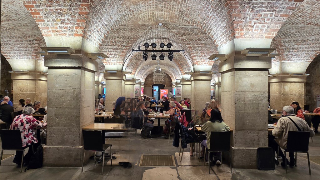 Then a short walk to the elevator that takes you to the crypt under St Martin in the Fields Church. I didn’t end up going inside the church this visit. I had just missed entry into the mid day concert. On a previous visit I had heard a rehearsal for a chamber concert which included Vivaldi’s “The Four Seasons.” The glass elevator is missed by most tourists. My last visit I stood in the crypt in a crowd of wall to wall people watching the first of several BREXIT votes. This one happened to be favorable to the crowd who were against BREXIT. The crypt has vaulted brick ceilings, a cafeteria, a brass rubbing station and a gift shop. This time the gift shop had shrunk (post Covid-19) and the brass rubbing station had moved into it. The gift shop still had a lively collection of books, cards, linens and housewares. I spent much longer than you might think trying not to buy a mug which would be too bulky and heavy to carry for the rest of the trip. In the end, against all reason I bought it and a box of Cartwright & Butler Lemon & Sultana Biscuits [shortbread type cookies with lemon & raisins] for friends back home. When I got back home it matched the card I received from my daughter.