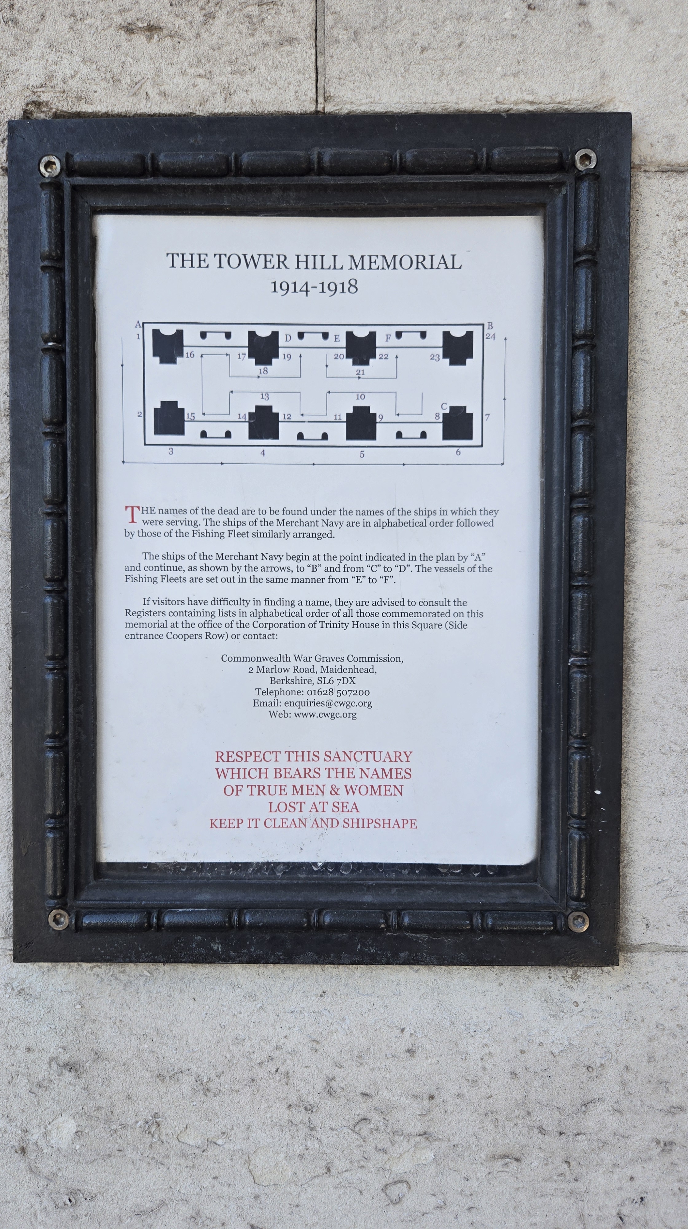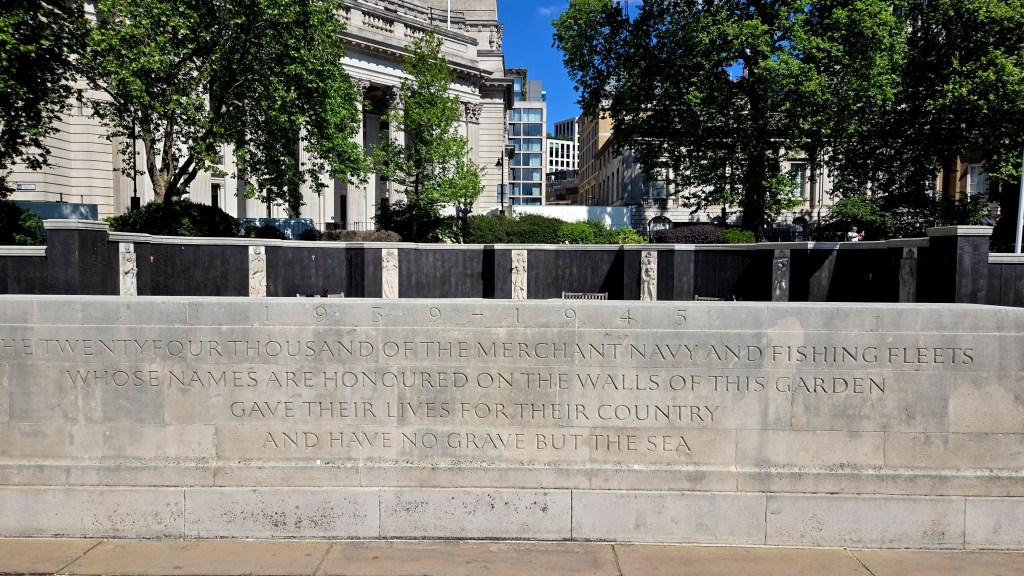 Since it was still before noon and check-in was 3 PM I dropped off my bag and went on my way. I should note this is a very convenient location. I was only staying a night but an upgrade to a view of the Tower of London should be considered. I had been to the Tower twice and was not planning on a third visit this trip. My destination was the ruins of St Dunstan in the East. However on the way I planned a repeat visit to All Hallows by the Tower. But first I visited the war memorial. You can see All Hallows through the memorial. Very moving.