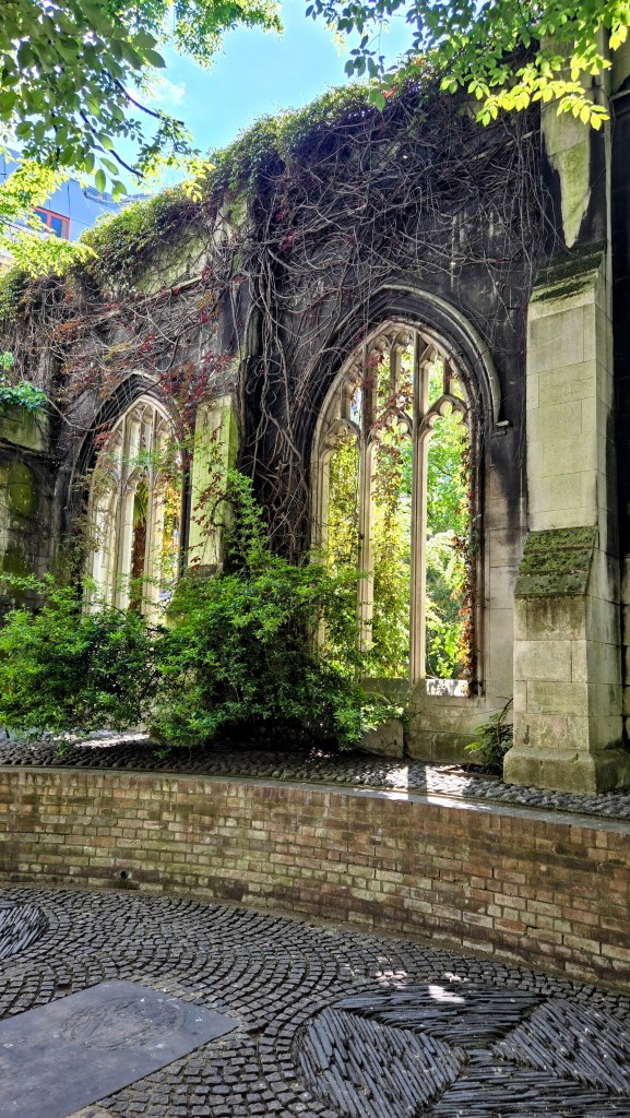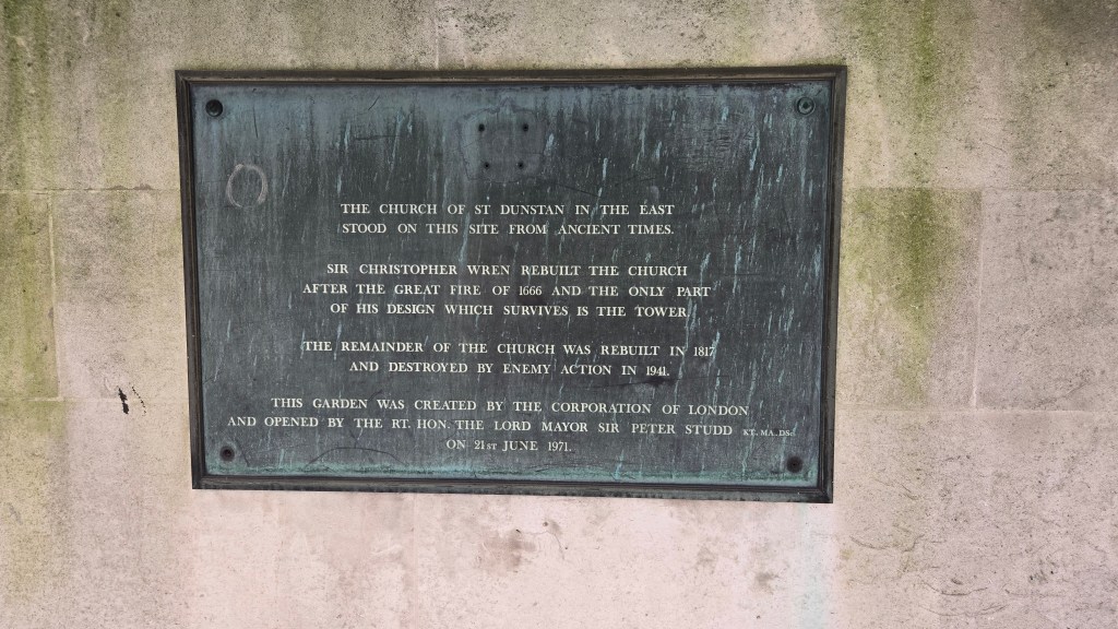 From here it is a short couple of blocks to the West to take you to the ruins of St Dunstan in the East (which is to the west of All Hallows by the Tower). The church was largely destroyed in the Second World War and the ruins are now a public garden. St Dunstan’s was originally built about 1100. A new south aisle was added in 1391 and the church underwent repairs in 1631. It was badly damaged in the Great London Fire of 1666. A steeple was added in 1695–1701 to the designs of Sir Christopher Wren who is probably best known for his redesign of St Paul’s Cathedral in London and the Sheldonian Theatre at Oxford. St Dunstan’s was severely damaged in the Blitz of 1941. Wren’s tower and steeple survived as well as the north and south walls. St Dunstan’s The parish is now combined with the Benefice of All Hallows by the Tower and occasional open-air services are held in the church. For most this ruin provides a quiet respite from the hustle and bustle of the city.