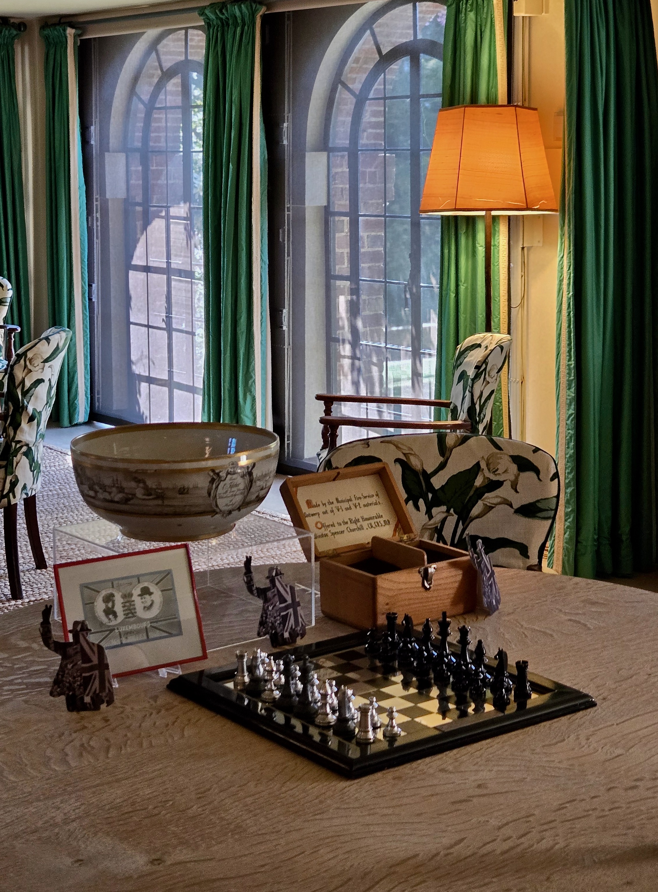 There are many things to see. And many things that are easy to miss. We were told by the attendant that the chess set in the foreground of this photo was on display for the very first time. It was made by the Municipal Fire Service of Antwerp of V-1 and V-2 materials. This is a stunning room full of light and the Calla Lily seat covers are 40’s style.