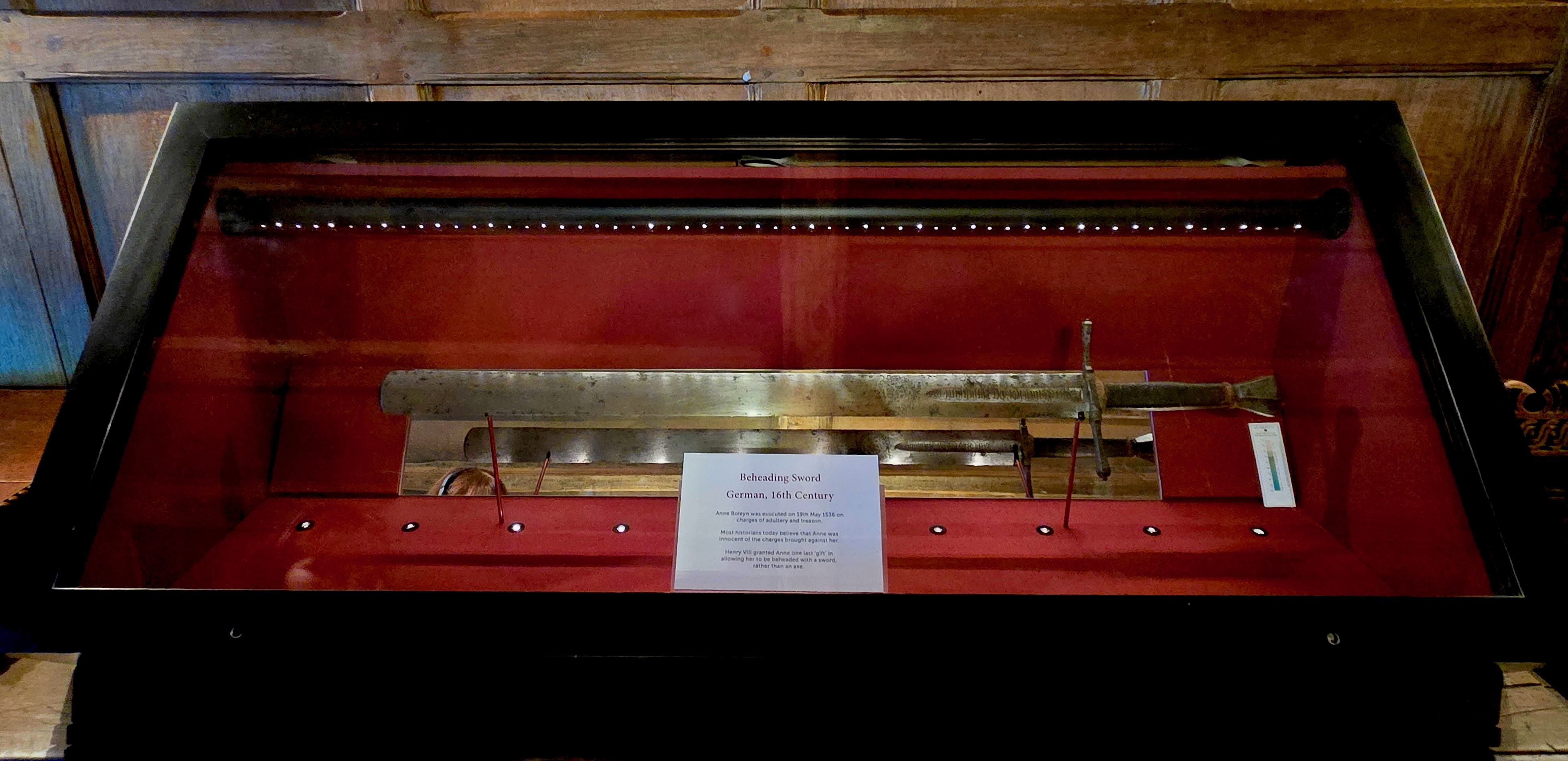 Anne’s first pregnancy ended with the birth of a daughter, on September 7, 1533, Elizabeth [who become Elizabeth I , Queen of England] . A second pregnancy ended in a miscarriage or stillbirth in 1534. The third pregnancy resulted in a miscarriage on January 29, 1536. Anne was executed less than four months later, on May 19, 1536. She was accused of adultery, incest, and high treason, although many historians believe these charges were invented to make room for a new wife and hopefully a male heir. Anne’s brother George was executed on May 17, 1536, two days before Anne, also for alleged involvement in incest and treason. King Henry VIII granted to Anne that she be beheaded by a sword rather than an axe. This sword is displayed here. A solemn reminder of the brutality of the time.