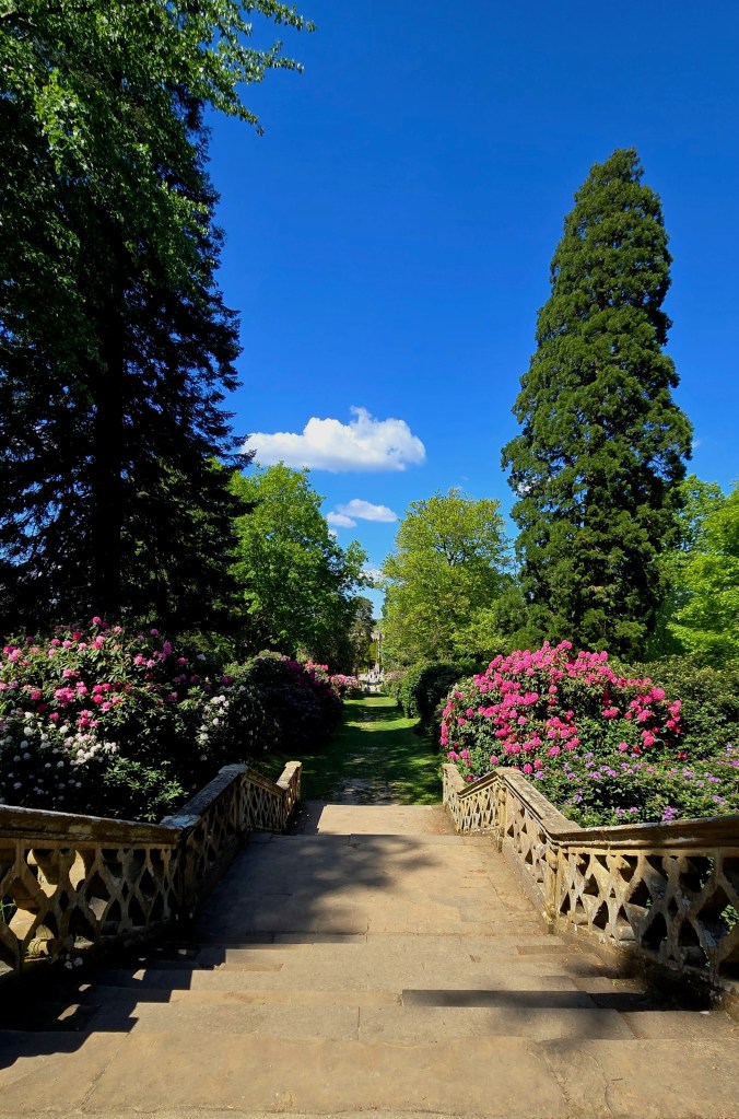 Exploring the Woodland garden at length, meant I missed the Rose Garden and the Italian Garden, and so it goes. These two photos are looking up toward the staircase to the woodland and looking back toward the castle. [Please expand to get the full experience]