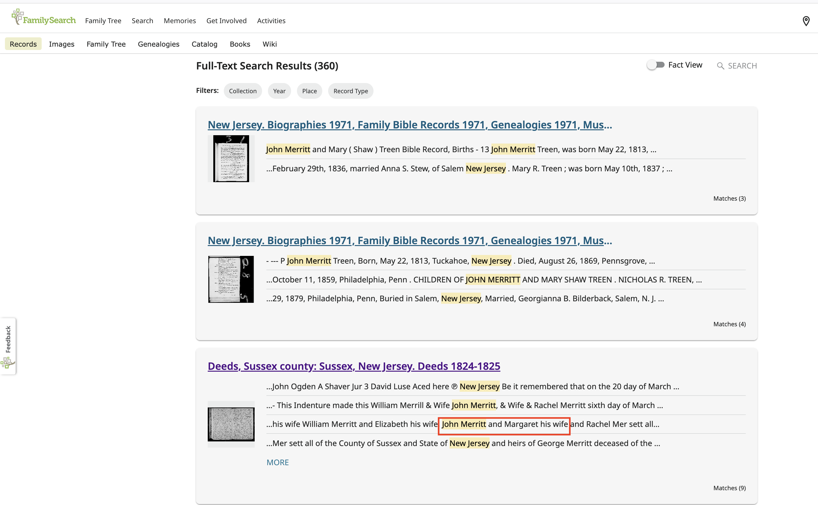 So for this blog post I decided to use the tool on my longest standing Brick Wall. I entered “John Merritt” New Jersey 1790-1830 as the search terms. This brought up 30 results. Scrolling through the first ones the third caught my eye. It is “John Merritt and Margaret his wife.” This is the first time I have found a John Merritt with a wife Margaret in New Jersey in the right time frame in 50 Years of looking. 🎉🎉🎉 WooHoo!