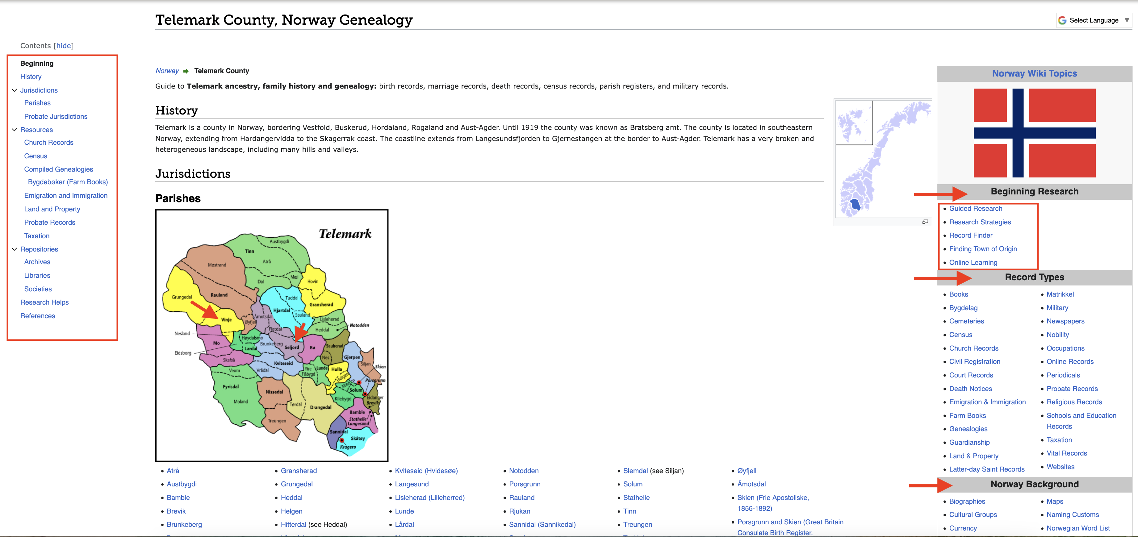 I clicked on Norway and then Telemark County. This is what it brings up. I have highlighted some of the rich resources on this page. Including two of the parishes where some of my ancestors hark from. These are incredibly valuable and for many places they are one of the best places to start your research. They are intuitive and easy to use. But if you still find them overwhelming there is more HELP available at Family Search.