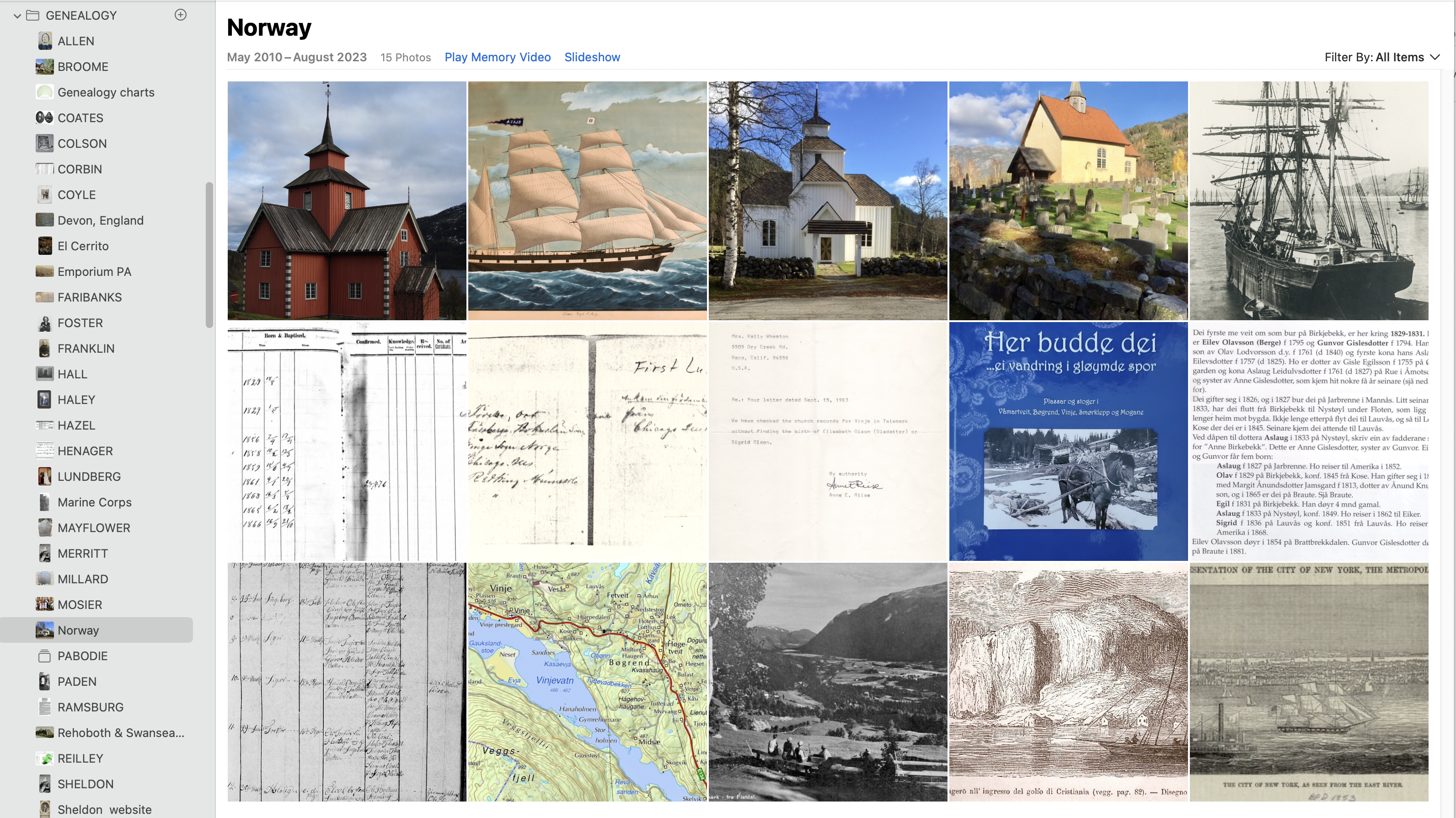 FOR DIGITAL FILES: Genealogy Family or Place > Surname> Family >Individual Family> and so on. Within an individual family there will be documents and photos as well as deeds, printed genealogies etc.