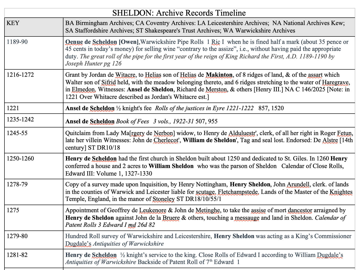Remember that these are organizational tools for you, so make them the way they make sense to you. Using the Tables feature in any Word Processing program can help. More complex tables can be made with a Spreadsheet program like Excel. When you are building trees you may wish to your the suffix field to your advantage. In my tree I have too many “John SHELDON”s so adding the year of birth or a locale can help. SO rather than searching for John SHELDON in my tree and getting 6 pages of John SHELDONs , I might see a list that said Sir John SHELDON of Broadway or John SHELDON 1645. What ever organizing principles you use—they should make your life easier not more difficult.