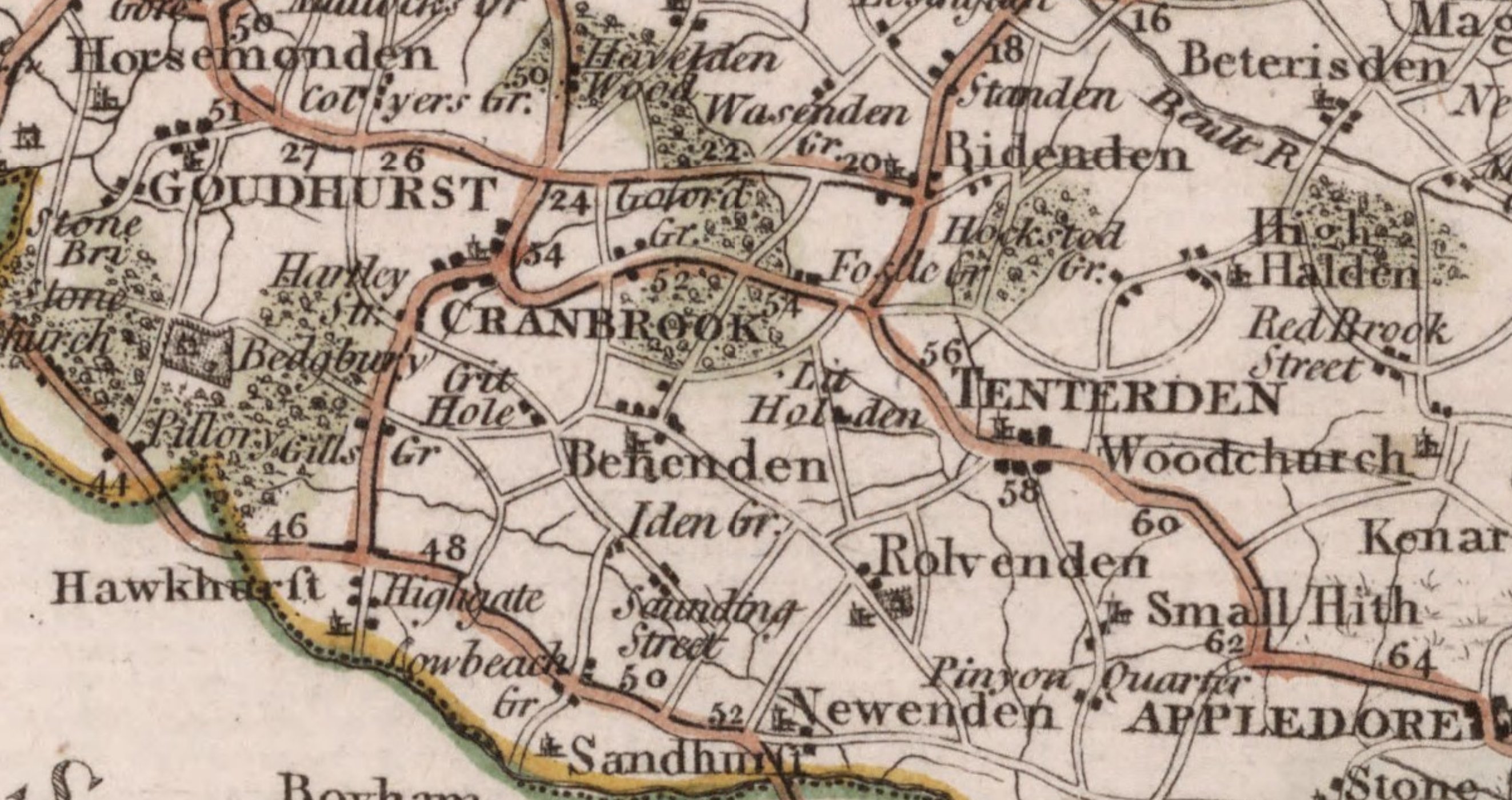 In the Domesday book the closest listed place to Headcorn is [East] SUTTON which had 15 villagers. 9 smallholders. 10 slaves; 8 ploughlands; 2 lord’s plough teams; 4 men’s plough teams; 8 acres Meadow. 50 acre Woodland swine render. 1 church. Annual value to lord: 12 pounds in 1086; 10 pounds when acquired by the 1086 owner; 10 pounds in 1066. Tenant-in-chief in 1086: Bishop Odo of Bayeux who also held Leed’s Castle. Curiously I can find no record referring to TILDEN people or places near Headcorn in the 12-16 centuries, so it is unclear when the road and buildings adopted their name.
