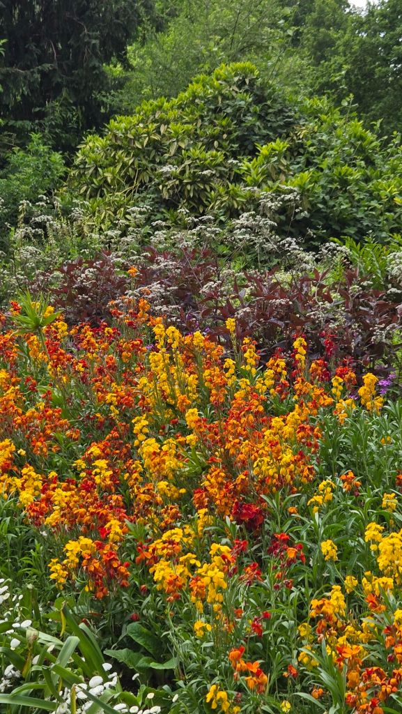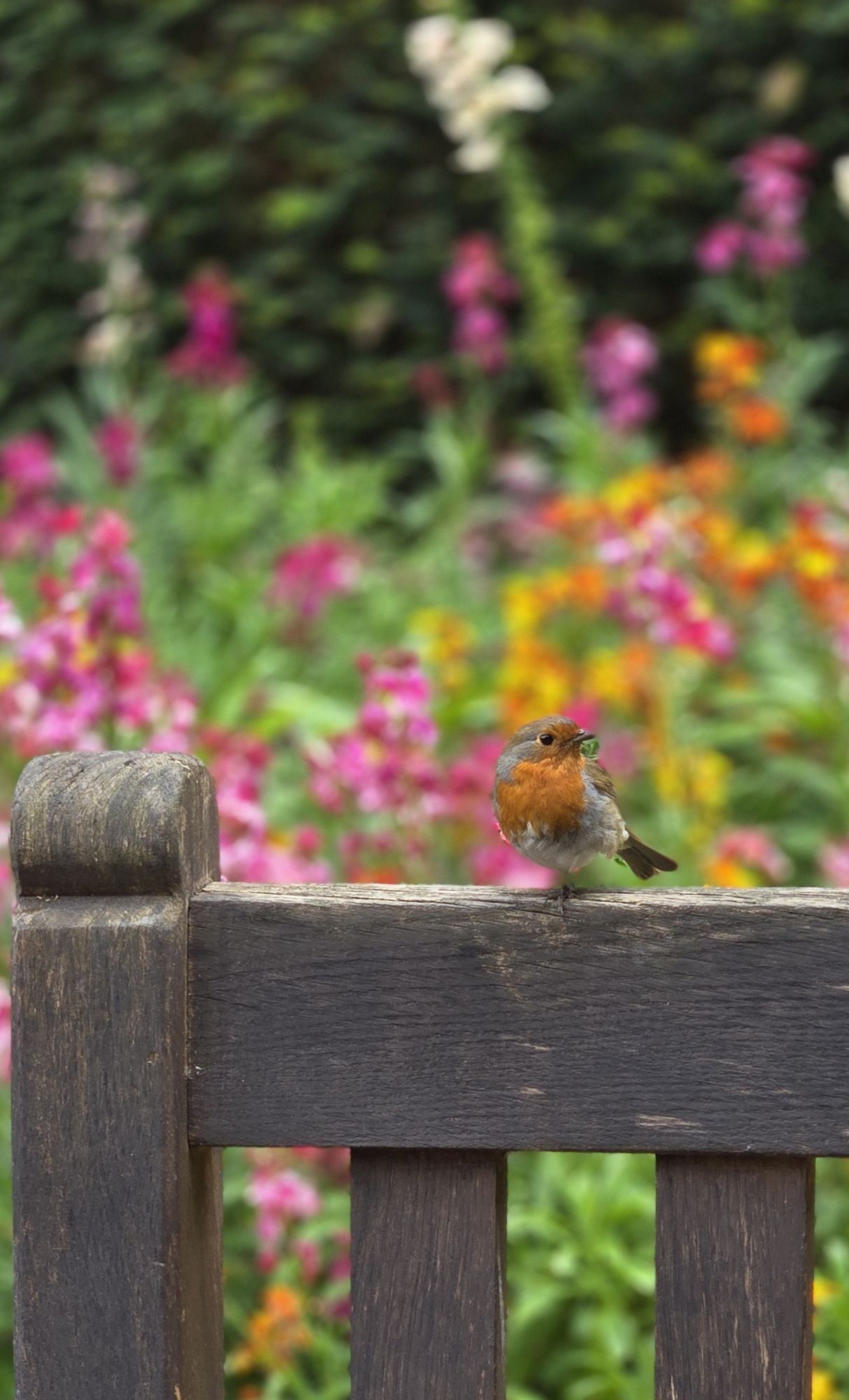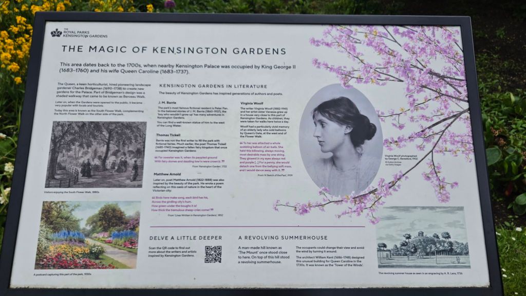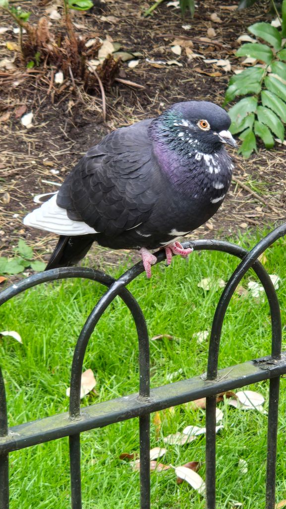 Rather than walk to the Diana monument I happened upon “The Flower Walk” which turned out to be magical. Greeted by very friendly squirrels and a robin greeter posed perfectly for photos in front of a matching bed of wallflowers. Three green parrots squalked loudly. Drawing my eyes overhead, as they flew off. They reminded me of San Francisco’s parrots of Telegraph Hill. Guessing they were once domestic gone wild and looking them up they are known as Ring-necked parakeets native to Africa.