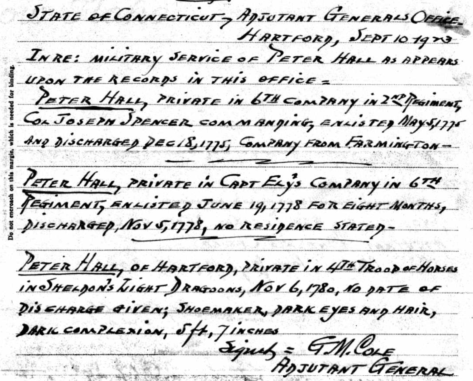 | 5 May 1775 | 19 | Peter Hall Enlists as Private to serve 7 mos in Col. Joseph Spencers 2nd Regiment; 6th Company Major Return Jonathan Meigs, Capt. Noadiah Hooker who marched to Roxbury, MA | Middletown, CT |