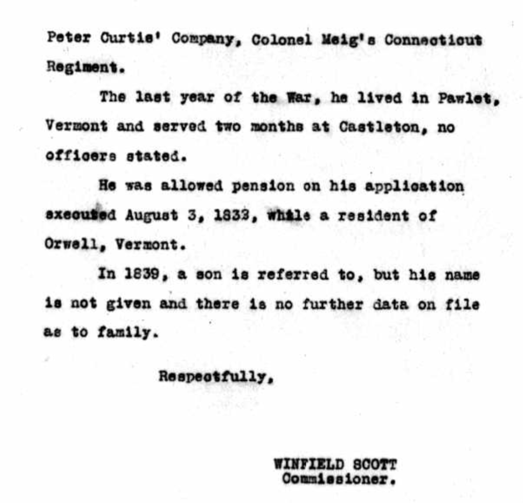 In 1775 He [Peter Hall] lived in Mansfield, Connecticut & immediately after the Battle of Lexington [April 19, 1775] he enlisted for seven months in Col. Meigs Regt, Capt Ely: Company Lt. Curtis — he does not remember the names of the other officers –marched to Cambridge & Roxbury & was stationed at Roxbury until his time was out, when he was discharged. His regiment was paraded at Roxbury during the Battle of Bunker Hill, but was not called into action. Soon after his time was out in the winter of 1776 he enlisted for three months & served in Captain Curtis Company I (being the LT Curtis above mentioned promoted) and marched for Whiteplains and after his time was out he again enlisted for seven months in the same company & Regt & marched to New York where he was when the enemy took the place in Sept 1776 — retreated to Whiteplains where he was discharged by Col Meigs –was not called into action at Whiteplains. In the winter of 1777 he again enlisted in Capt Curtis’s Company again for three months and marched to Whiteplains & Horse Neck and served guarding the line and in the winter of 1778 he again enlisted and, served three months in Capt Curtis Company again in guarding the line about Horse Neck and Whiteplains making in whole twenty three months of service. In addition to this he remained in service a fortnight at Roxbury after his time was out in 1775 until the new recruits came in. His memory is very much gone & he couldn’t remember the names of other officers under whom he served nor the precise time when he entered & left service –nor other regiments with whom he served. He knew Gen Washington, Putnam, Lee, Sullivan, Gates, Schulyer & many others whose names he forgets. He never recvd . a written discharge except from Col. Meigs above mentioned & this he has lost — He has no documentary evidence, &knows no person whose testimony he can procure who can testify as to his services, He was born in Mansfield 1 August 1755 his age is recorded in his Bible, & in the town clerk’s office in Mansfield. Soon after the close of the revolutionary war he moved to Orwell, Vermont where he has ever since lived. –He is known to Rev. W Kellogg, & to Apollos Austin Esq. whose affidavits he has present & to most of the inhabitants of Orwell. He forgot to mention that the last year of the war he lived in Pawlet, Vermont & volunteered service about two months at Castleton & assisted in building a Picket Fort there –but he has forgotten the names of the officers under whom he served. R.C. Royce Registrar signed Peter Hall.