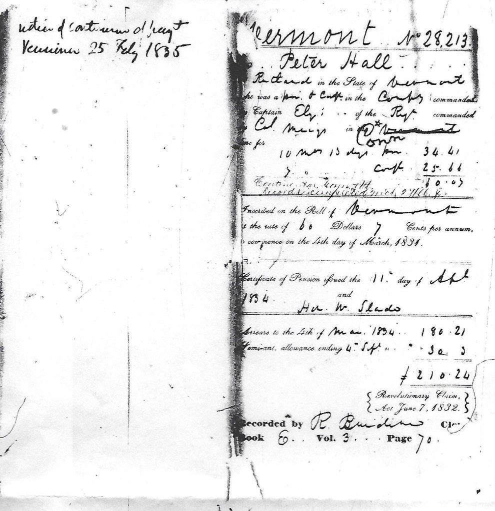 Sir the undersigned the constituted authority of the Town of Orwell– having learned that the application of Mr Peter Hall (through his agent B. Temple Esq of Rutland) for a pension for Revolutionary Services—has not been granted to this time, they have to offer a few remarks for your consideration & information— Mr Hall was one of the first settlers of this town a farmer, his character for honesty, truth & patriotism stands as fair as any man of our acquaintance for that moral honesty he has become proverbial among us— We have ever believed he was justly entitled to a pension and we heard his tales of Revolutionary Services when his mind was good, it is now gone, which places him under embarrassment about procuring testimony–his statement here every one believes –& all regret the state of his mind is such that he can do nothing to assist himself— He enlisted at Mansfield Connecticut under Capt Peter Curtis–served three campaigns the first at Boston, Roxbury and he tells of assisting in taking & destroying a Lighthouse in Boston Bay. At Hackensack, NJ —He was for a time at NewYork–tells of rowing all night—to bring out [the] army from Long Island—of a retreat to the White Plains, of his discharge a short time before his enlistment expired in consequence of fever ague [Malaria]. –is Positive he was discharged by Col. Meigs–this is the most we can learn from him. —& In saying we believe– is we are confident we speak the feelings of all acquainted with him—we might add that Mr Hall is & has been from an early day a regular member of the Christian Church & an exemplary Christian. —The state of Mr Hall’s income is such that a pension would be a timely aid to his infirmity & would be well used by him—should your honor grant our request by placing Mr Hall on the Pension List we confidently believe you will nut have conferred it on a more deserving man—we remain with the highest respect your humble servants. Orwell 15 January 1834 Signed Mr B. Temple of Rutland, agent for Mr Hall; Roswell Bottems Jr Town Clerk; Bishop Bottom and Ruluff White, Selectmen; Chauncey H Conkey 1st Constable; Asa Fletcher Town Treasurer