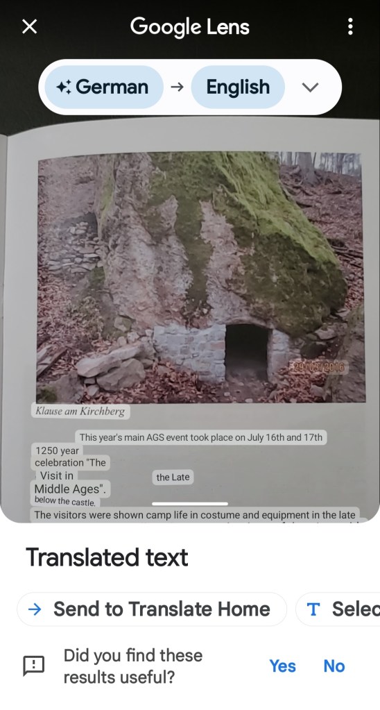So it took me awhile to turn this new found tool, onto foreign language texts or documents. You have two options in Google Translate: Conversation, for spoken language and Camera for writing or texts. Choose camera and with Google Lens aim at the text you want to translate. Obviously it does better with printed text but can sometimes manage handwriting. The second option is to send the translated text in the original language and the translation in English to your phone where you can copy it and send to yourself by email of text. Now mind you it isn’t perfect but it’s darn good. So on the left we have a photo of the original text. On the left is the translation as it appears on the Phone screen and you can see at the bottom “Send to Translate Home” where it will send to your phone the text in both German and English. This works on any two languages you choose.